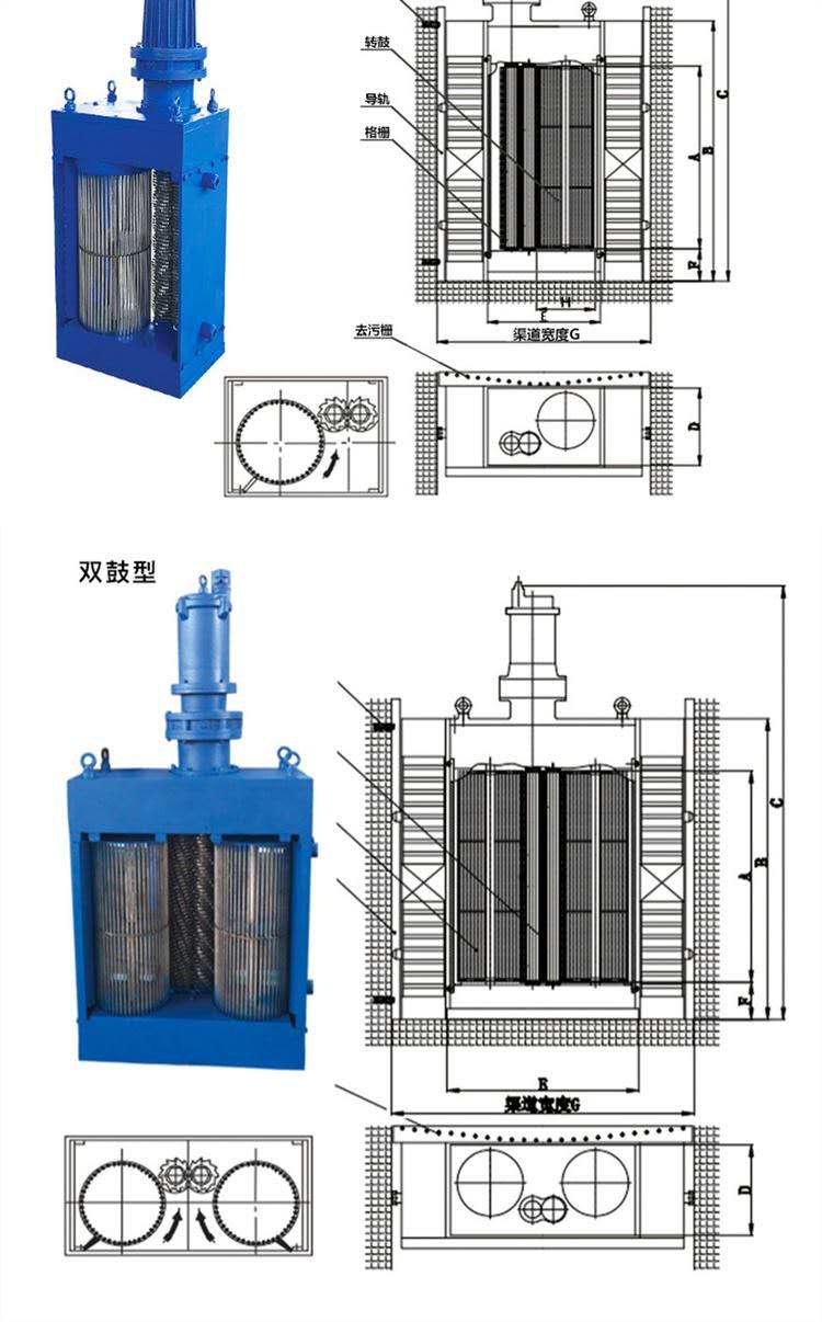 粉碎型格柵由干濕兩用防爆電機、變速箱、變速器、刀片、立式滾筒、密封、安裝支架、溢流格柵、潛水電纜、備用手動格柵等組成的粉碎格柵清洗機。電機啟動后,葉片和立式滾筒以不同的速度旋轉(zhuǎn),污水進入滾筒區(qū)并送到切割區(qū)后,旋轉(zhuǎn)柵格截取污水中的固體浮物。采用差動旋轉(zhuǎn)的兩組葉片在軸向和徑向快速切割。它被粉碎成6~10 mm的小顆粒,大部分其他污水和足夠小的顆粒直接通過滾筒區(qū)域,破碎后的小顆粒隨著水泵的抽水而流動。